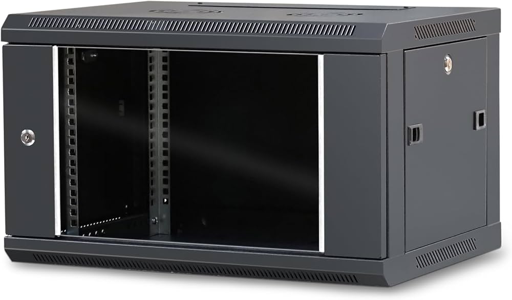 Coffret mural rack 6U avec porte vitrée en verre trempé, idéal pour matériel réseau ou vidéosurveillance.